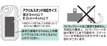 アクリルスタンドとスマートフォンの間に市販の背面用フィルムを入れて使用される場合、厚み0.2mm以下の背面用フィルムをご使用ください。